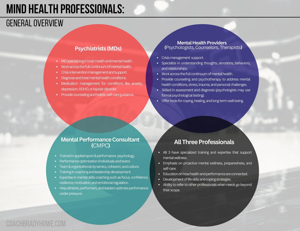 Mental health providers are clinical practitioners, such as psychiatrists or psychologists, trained in clinical psychology and medicine, with the expertise to diagnose, treat, and support individuals across the continuum of mental health. Their work and practice often involves counseling and psychotherapy, built from integrative psychological theories such as Cognitive Behavioral Therapy (CBT) or Acceptance and Commitment Therapy (ACT), tailored to address each individual’s unique needs and challenges. When appropriate, they may also provide medical interventions such as medication management. These practitioners address conditions such as anxiety, depression, trauma, or other psychological concerns, while also providing crisis management and ongoing therapeutic care. In addition, many clinical practitioners have earned subspecialties, such as sport psychology credentials, or also provide mental performance training.